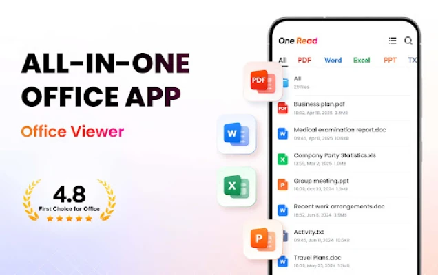 Насладете се на несравнимо удобство с пълнофункционалния файлов мениджър, вграден в All Document Reader. Преглеждайте всичките си файлове в позната папка структура, бързо намирайте необходимите документи благодарение на централизирания списък и маркирайте любими за още по-бърз достъп. Приложението гарантира плавно и елегантно четене на Word документи, бързо отваряне на Excel таблици и висококачествено представяне на PowerPoint презентации. Независимо дали преглеждате обширни доклади или просто четете текстови файлове, All Document Reader осигурява стабилна и бърза производителност, която не изисква интернет връзка.