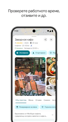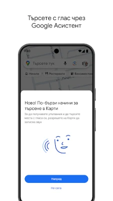 Изследвайте света около себе си с увереността на местен жител, възползвайки се от карта, която се обновява непрекъснато с приноса на над 500 милиона потребители всяка година. Избягвайте тълпите, като проверявате натовареността на дадено място, преди да го посетите. За още по-интуитивна навигация, използвайте „Обектив в Карти", за да видите пешеходни упътвания, наслагващи се върху реалната среда. Филтрирайте ресторанти по кухня, работно време, ценови диапазон, оценка и други критерии, и задавайте въпроси за места – от менюта до опции за паркиране – получавайки бързи и полезни отговори. Добавете Tiles и Complications към вашето устройство с Wear OS за бърз достъп до търсене и навигация директно от китката си.